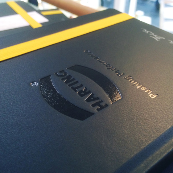 Auf dem 2-stöckigen Messestand hatte ich 5 Tage lang einen wunderbaren Arbeitsplatz ganz oben – mit Blick über die Messe, umgeben von interessanten Menschen aus aller Welt. Meine Aufgabe war es, die hochwertig produzierten Bücher im Corporate Design des Unternehmens für die internationalen Besucher und Gäste des Harting-Messestandes mit individuellen Kalligrafien in Namensform zu versehen.